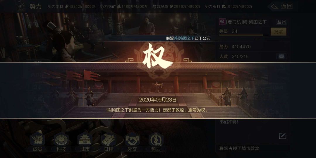 9月23日晚上,微信一区迎来了一个重要时刻,鸿丨鸿图之下联盟成功打下第一个8级城敦煌并成功立国。这是鸿丨鸿图之下联盟第一次立国,相信很多小伙伴们也对这次事件很感兴趣。