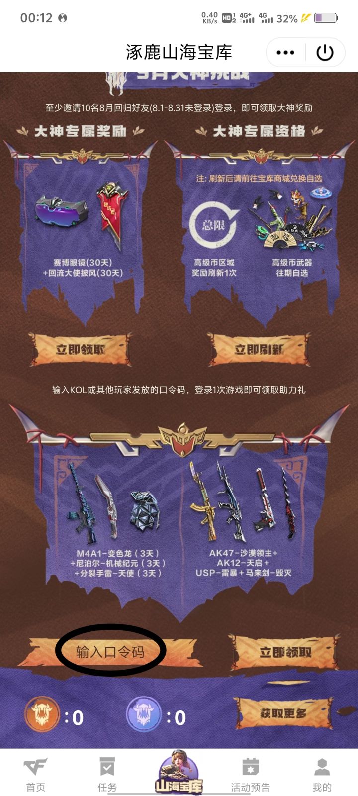 必得888钻、璀璨星辰抽奖币×10、鬼魅双生抽奖币×10,操作方法:上游戏,找到嘉年华,然后往下面翻,进入9月宝库,输入兑换码:cfm5uyt8,即可领取奖励,按照8月宝库的经验回流玩家永久英雄级武器概率非常大,祝家人们都能爆成品,说能领王者武器的码都是引流的,我这个保底钻石抽奖币,9月一起薅羊毛