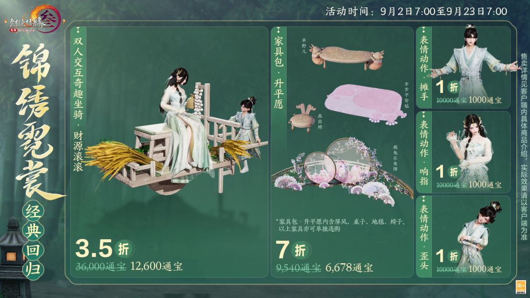 ● 往期“锦绣霓裳”奖励回归,双人奇趣坐骑“财源滚滚”和精美家具包,以及多种表情动作同步上线,不要错过哦!