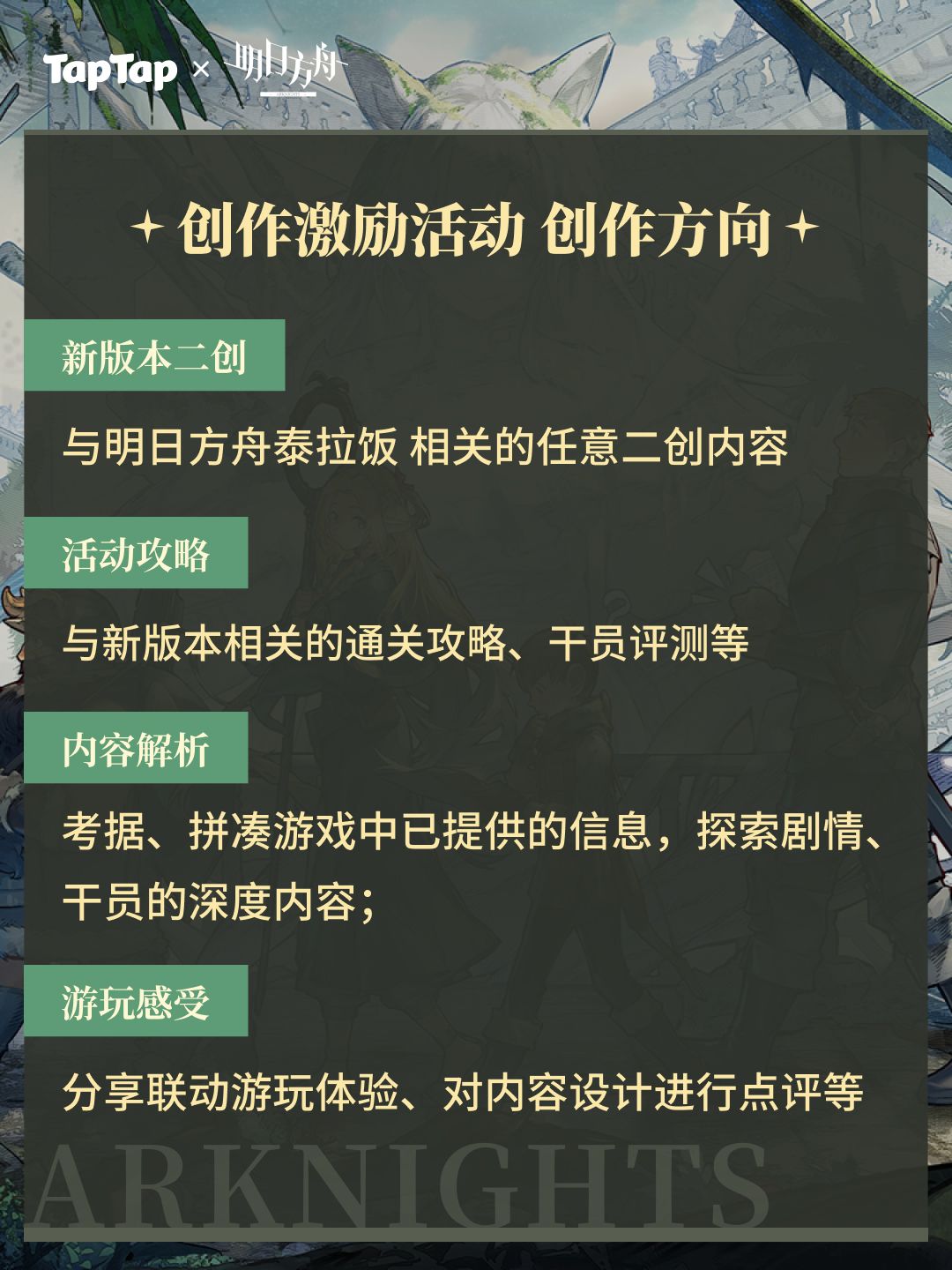 创作方向:包括但不限于新版本二创、活动攻略、内容解析、游玩感受等方向