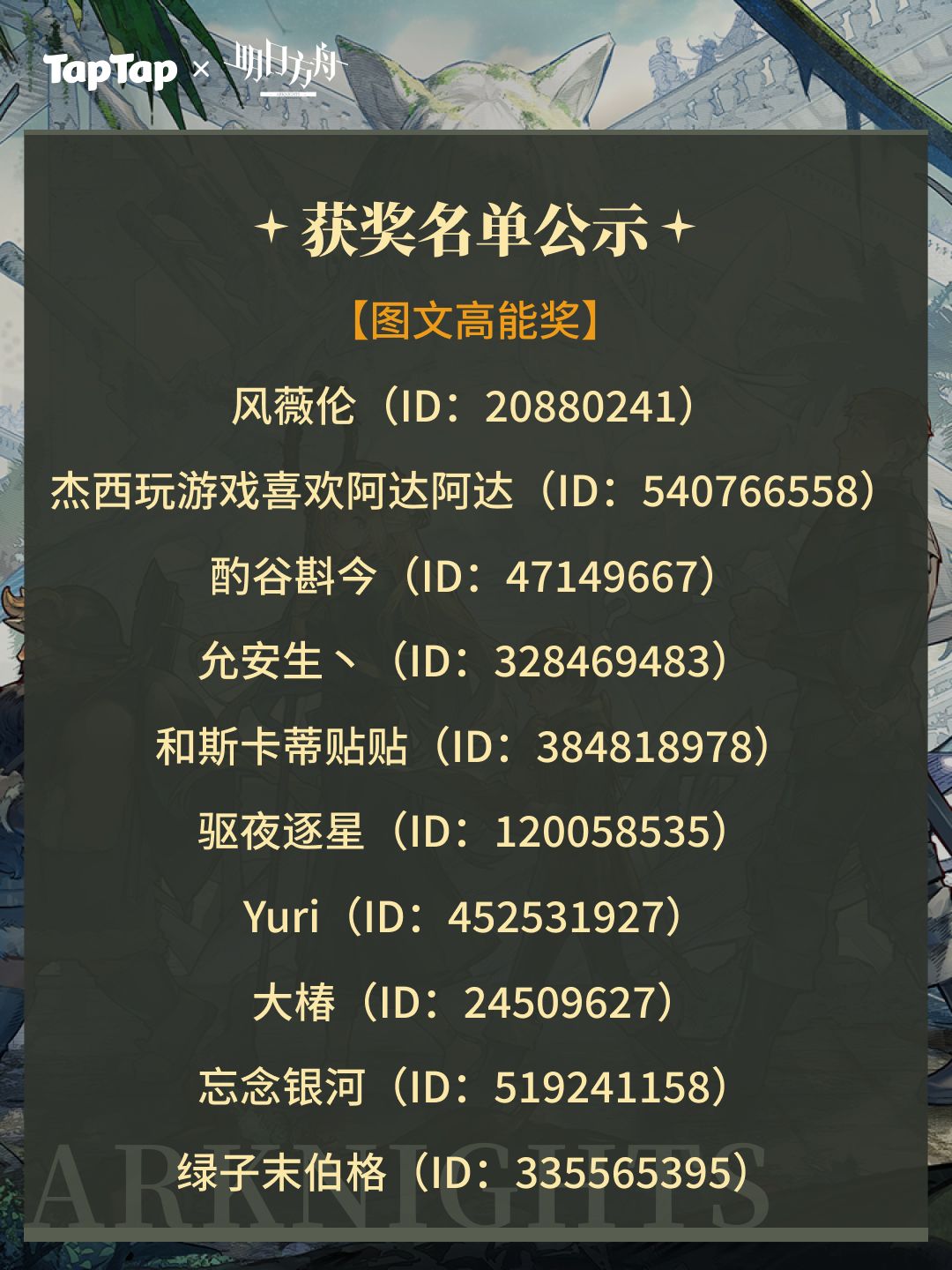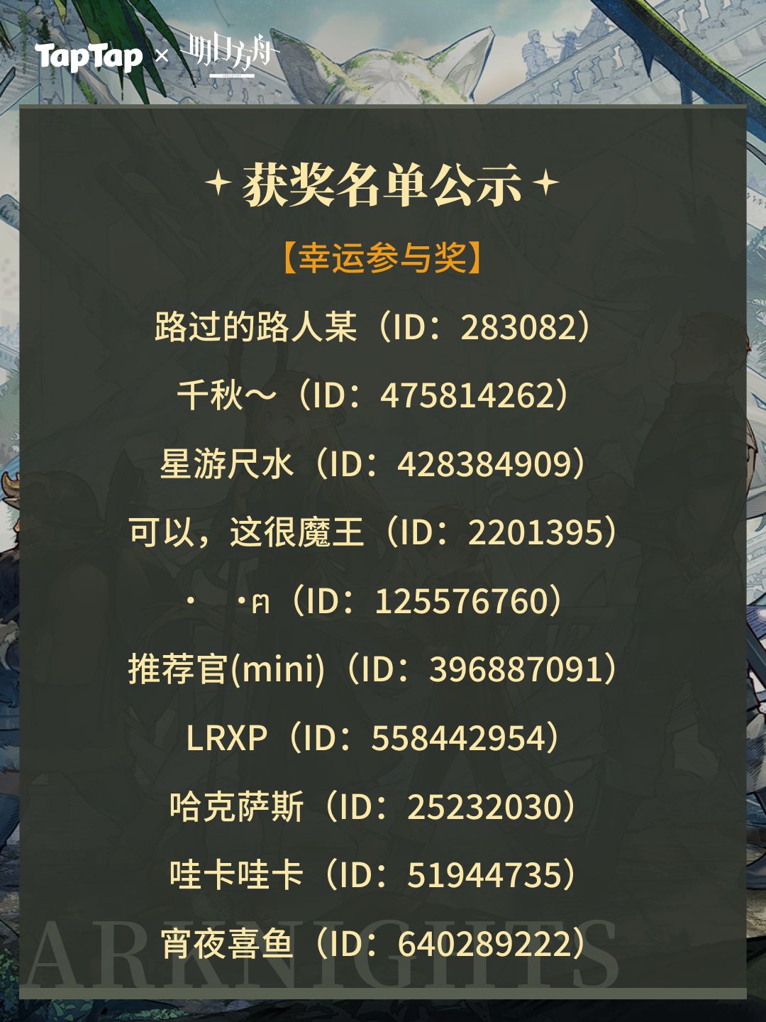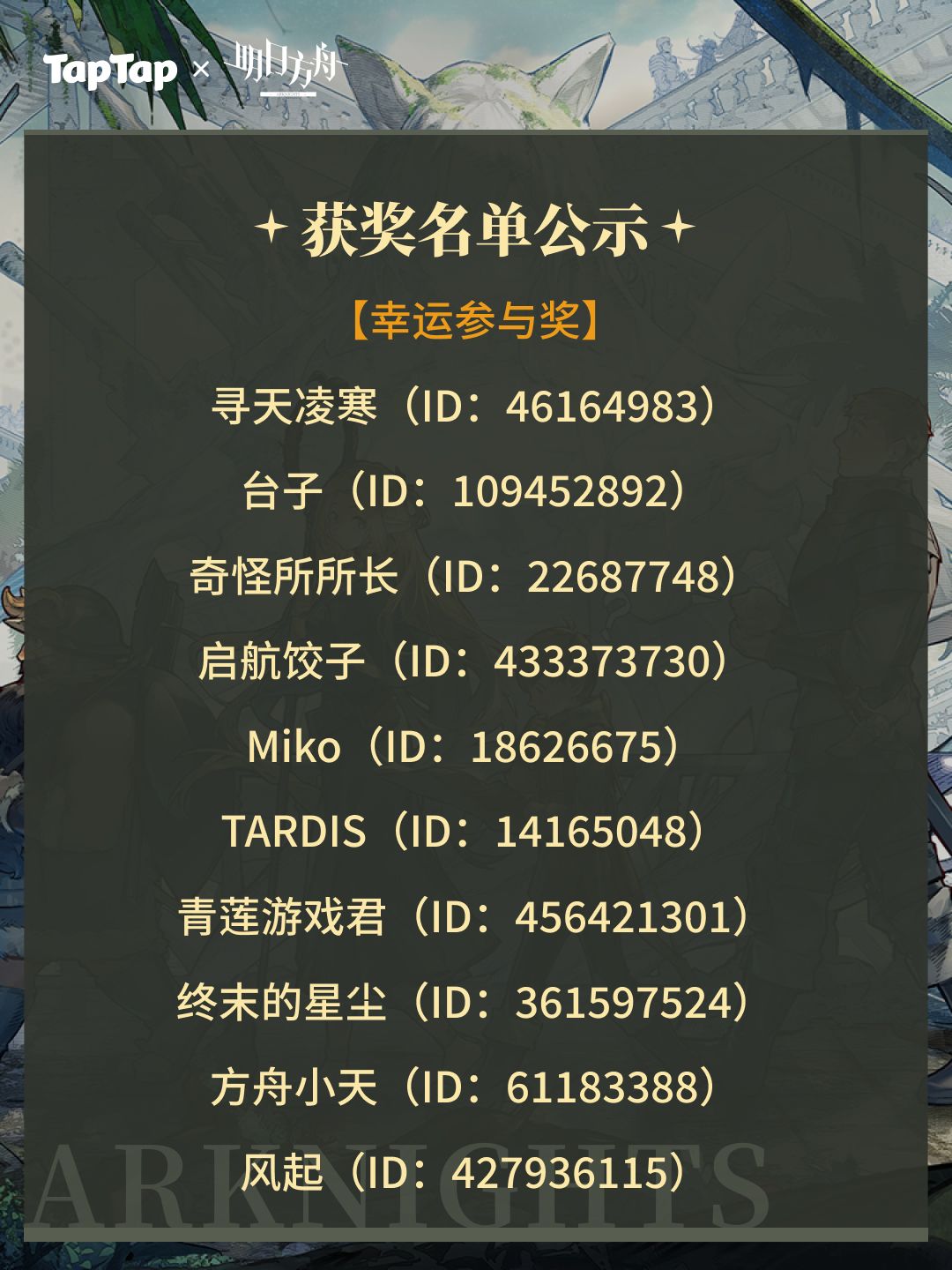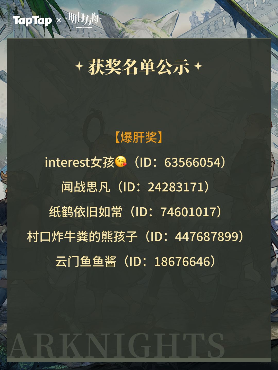-周边奖励:本次活动中周边奖励均由明日方舟提供,将在活动结束后20个工作日通过站内信收集用户信息,信息收集完毕后30个工作日内由游戏方发放