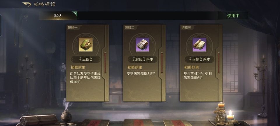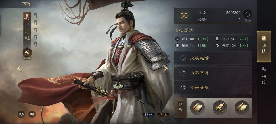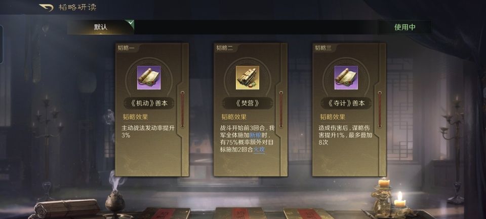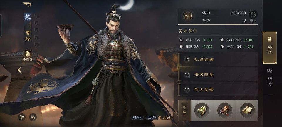 曹操战法:乱世奸雄+清风驱疾+烈火焚营。韬略库:孟德新书(上卷)+威帅善本+兵令善本。重盾兵特性不屈,专精点亮屹然不动。为了进一步锁定陆逊每次都能焚烧,曹操也带上了烈火焚营,需要注意额外通过坐骑增益才能争取让他的先攻高于陆逊。如果曹操的火攻能和董卓的火攻混到一起,还能让敌人陷入混乱,这个干扰因素也是不容忽视的。