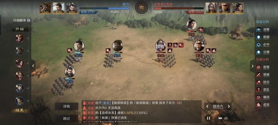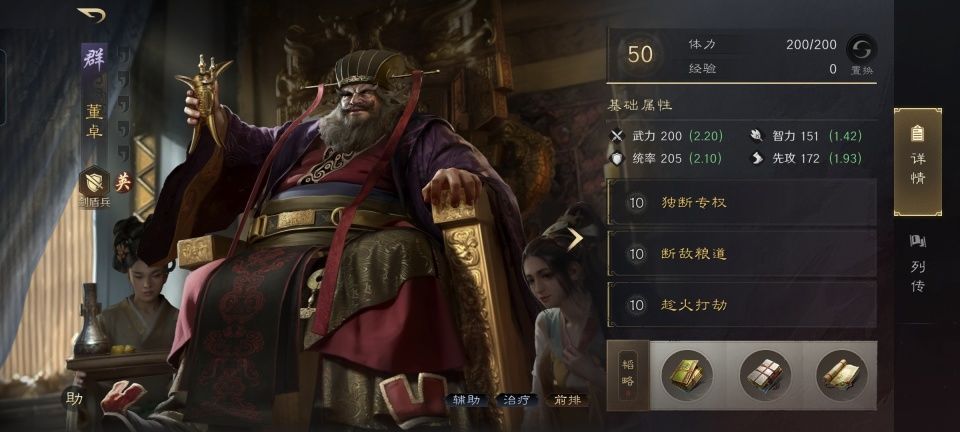 董卓战法:独断专权+断敌粮道+趁火打劫。韬略库:王臣(专属)+避险善本+兵情善本。剑盾兵特性专注,专精点亮以逸待劳。治疗、驱散、断粮、火攻、混乱,都是董卓可以为队伍提供的负面效果。其中最重要的还是火攻,董卓的先攻值是这支队伍里最高的,故而完全能够赶在陆逊之前放火。