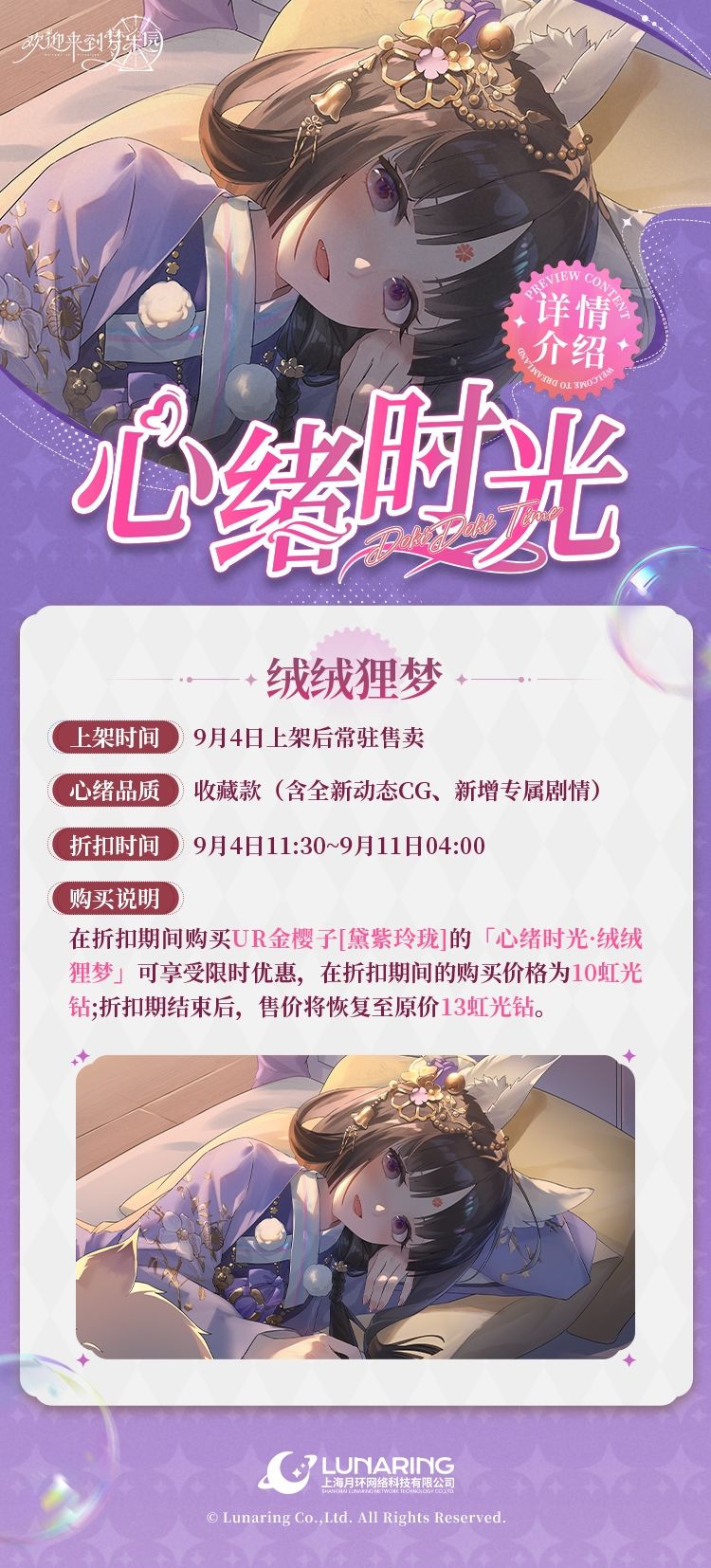 - 售价:在折扣期间购买「心绪时光·绒绒狸梦」可享受限时优惠,在折扣期间的购买价格为10虹光钻,折扣期结束后,售价将恢复至原价13虹光钻。