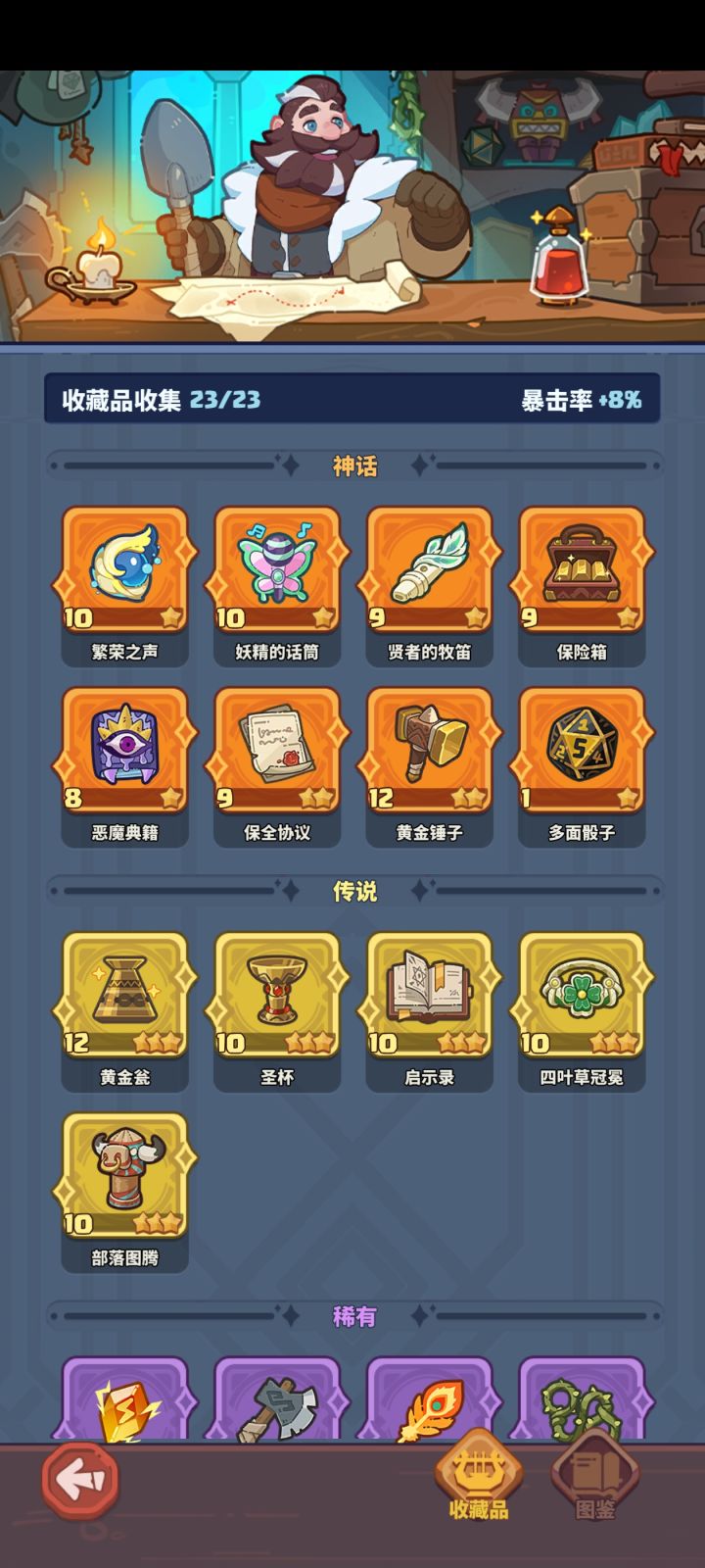 攻击力:巨剑企鹅 全体加攻5%,6级后解锁眩晕。企鹅好多神话英雄均需要,如非必要不要合成暗影猎手。游戏里最好玩的白板英雄:小偷,6级后解锁偷钱,打各种关卡必备。普通过了,建议先把猎手升级到6级,企鹅和三角板升到6级再去碰困难。藏品的话,锤子和保险箱很重要,一个是加攻击力,一个是每回合给你额外的钱。![[表情_斜眼笑]](https://img.tapimg.com/market/images/d1b1dcc88719f6c9a639728cde152c4b.png)