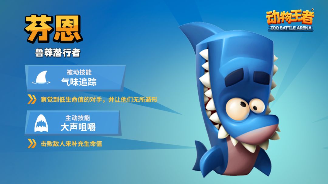毫无疑问,鲨鱼在水里速度相当快,并且是目前公测版本13只动物里,唯一可以在水中释放技能的英雄!自动获取低血量动物的视野,并且伤害到敌人后就可以自动恢复生命值。