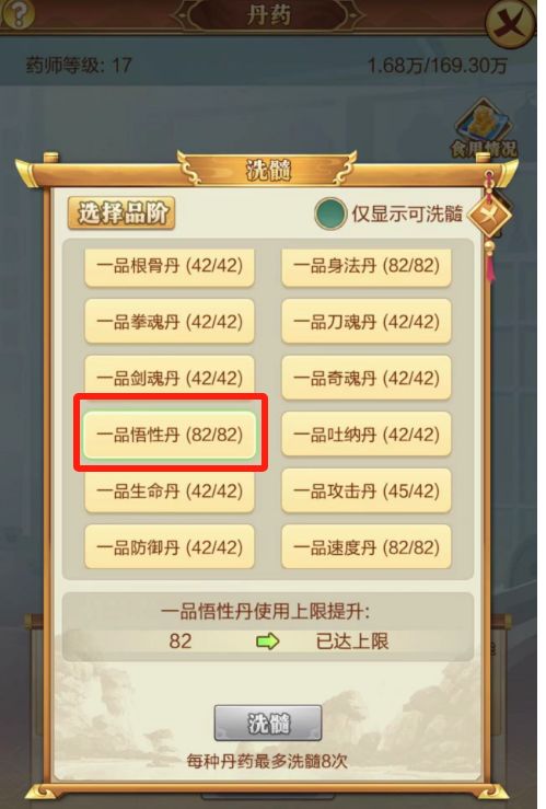 注:修炼丸不要一下全干掉,干几枚注意看境界提升是否满了。如果满了没升级继续用,会造成浪费(原因是,每次升级,悟性也会提升!!)!