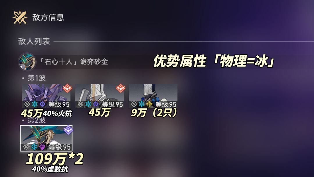 优势属性「物理=冰」,特殊抗性「诡奕砂金40%虚数抗、外宇宙之炎40%火抗与灼烧抵抗」。