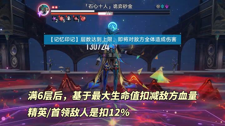 新波次/轮次时开始从0计数,我方每攻击1次叠加1层【记忆印记】。每层印记全队获得8%增伤,至多6层48%增伤,且满6层时对敌方全体基于生命值上限伤害(精英/首领扣减12%)。