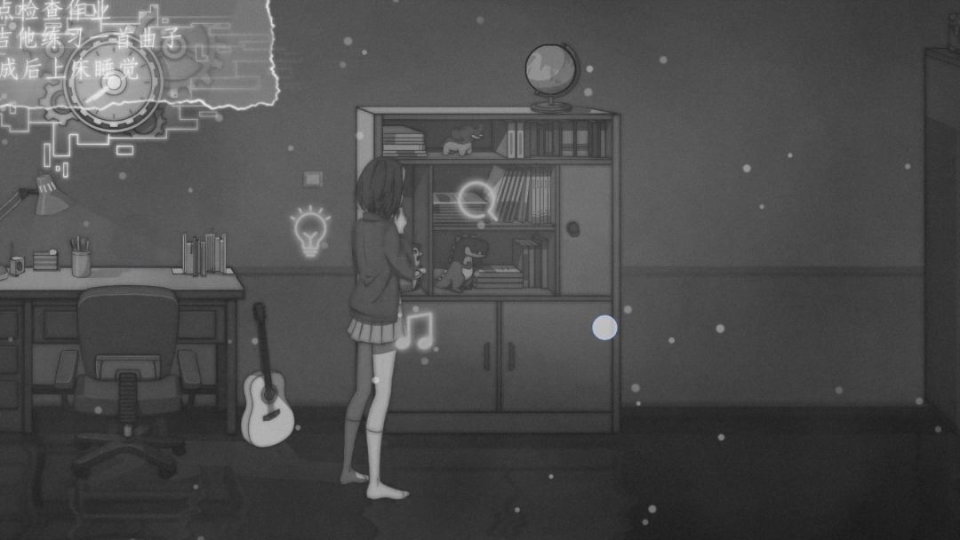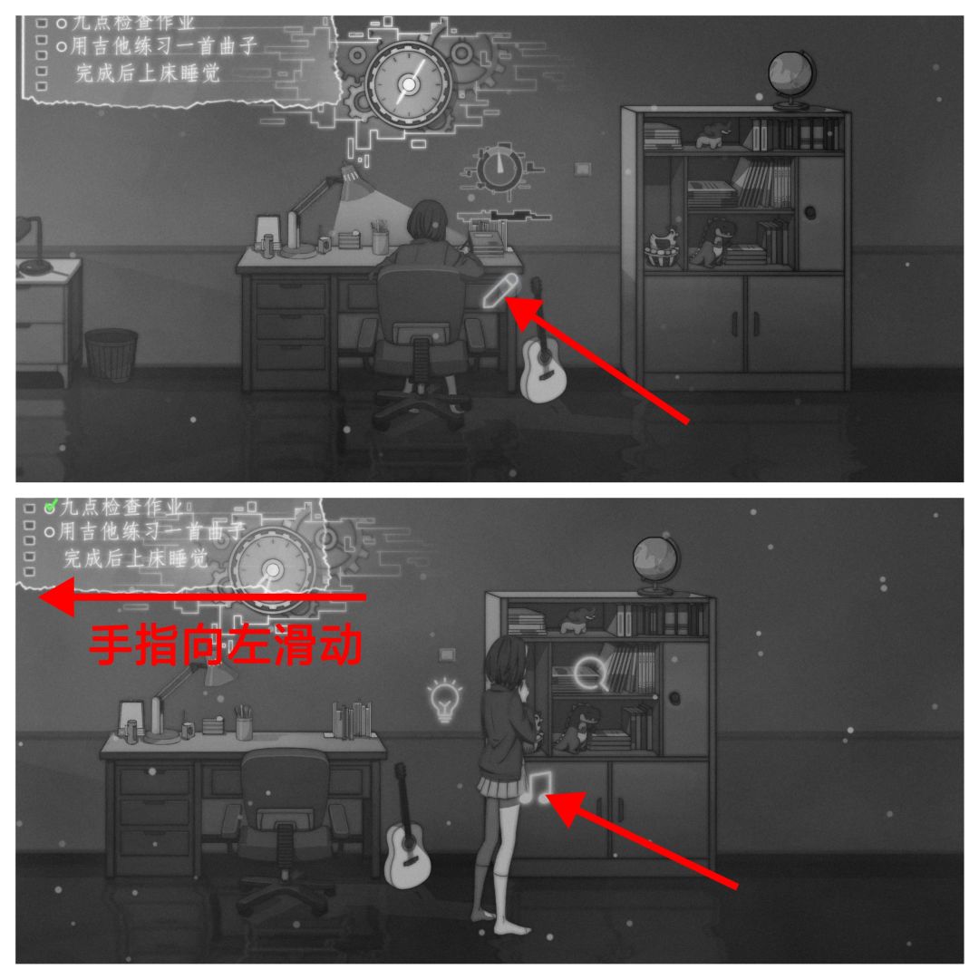 5.第三个夜晚,一开始女主的爸爸会把吉他收走,所以之后演奏前我们需要先获得【吉他】;老样子,先做作业,qte校准;完成后向左滑动屏幕,点击离开卧室;继续左滑屏幕到头,点击探索壁橱,这里会触发qte校准,完成后获得【吉他】;向右滑动屏幕,回到书架前,点击音符开始演奏;演奏流程可以参考上方第四点中视频后半段👆🏻