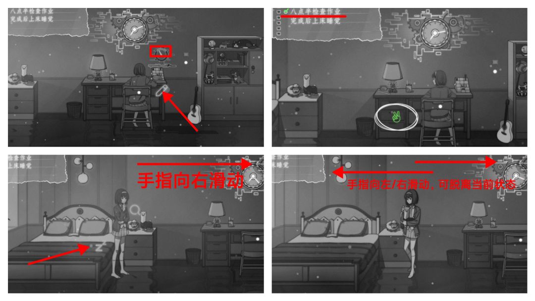 3.第一个夜晚,做作业会触发qte,需要在指针指向白色区域时快速点击铅笔图标,最后指针落在白色区域即为判定成功,进度条满后第一项任务完成;向右滑动屏幕来到床边,点击床,上床睡觉,结束第一天(温馨提示,如果碰到触发事件无法脱离,比如,拿起🦙娃娃没有放下的按键,可以通过向左/右滑动屏幕脱离当前状态)
