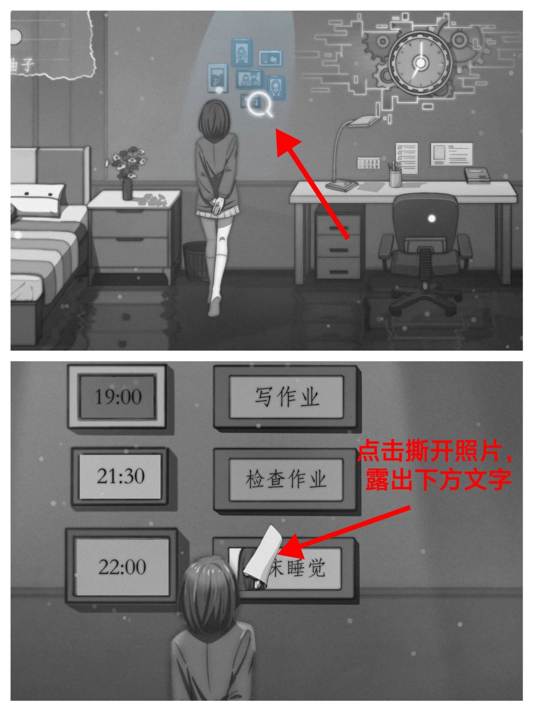 温馨提示,“课外作业”和“上床睡觉”这两个任务不完成也不会有任何影响,也不会改变既定结局;此外,房间内还有许多可交互的地方,请大家自行探索,同样,不点也不会有任何影响)