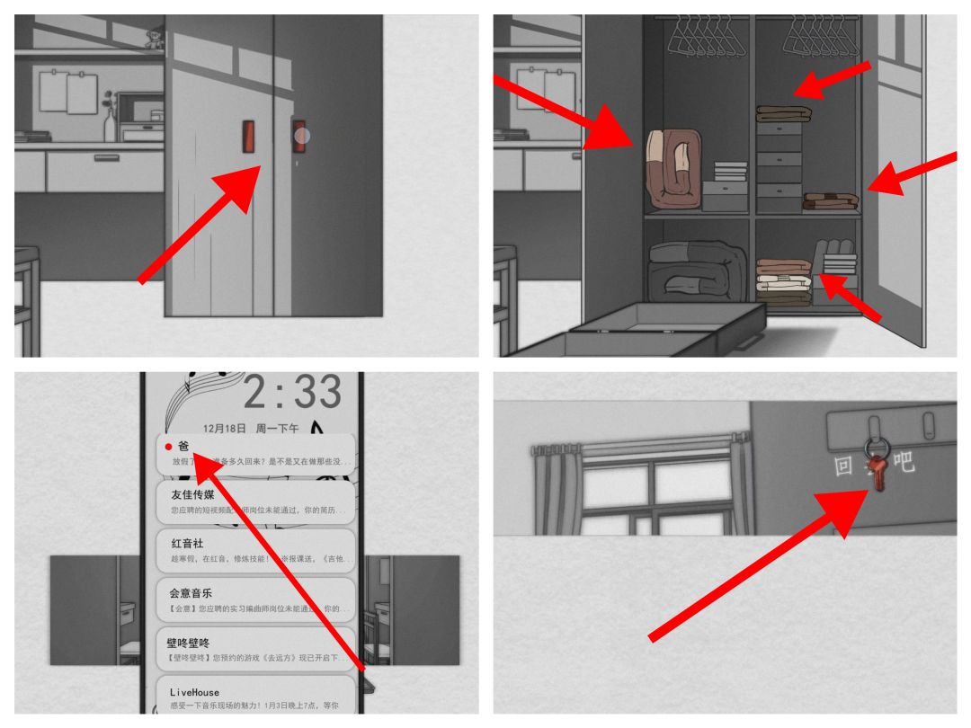2.画面滑动到尽头,回到了现实,点击打开衣柜,点击被褥,放入行李箱;点击查看父亲发来的短信,再点击拿起钥匙,接着女主陷入了小时候的回忆中