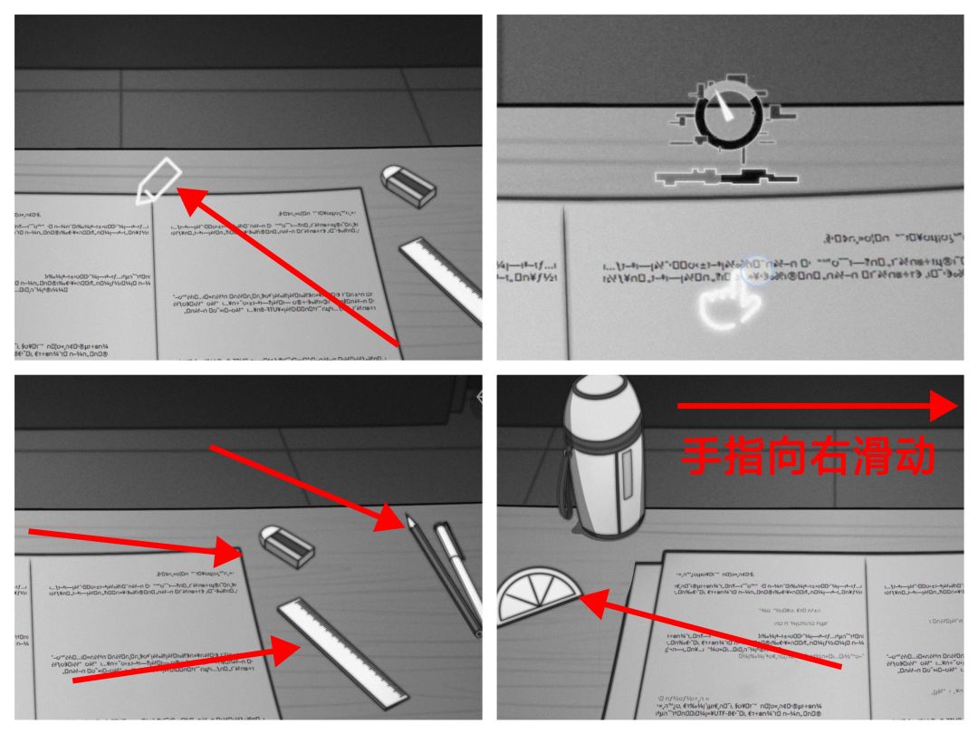 8.记忆再次涌上心头,画面来到女主小时候考试的场景;点击铅笔图标开始作答,会触发校准;挨个点击橡皮,尺子,钢笔,别忘了向右滑动还有个半圆尺;(之所以点这些东西倒不是为了辅助做题,而是女主考试时心不在焉,手头把玩需要…当然最后的成绩也不太好…)