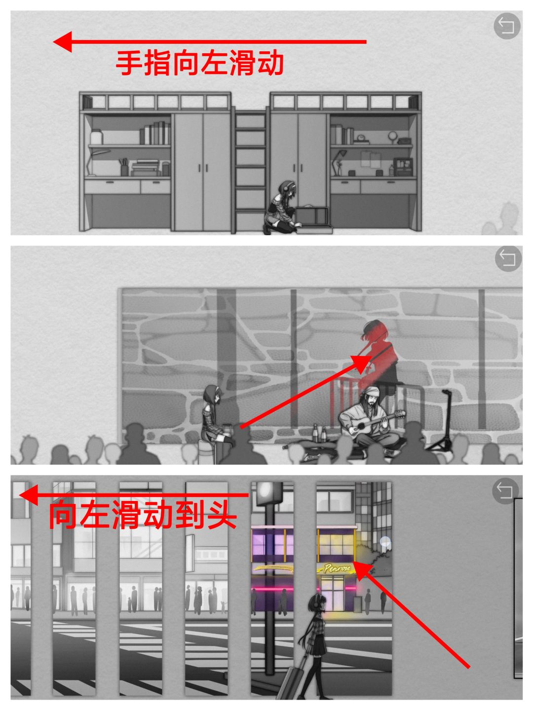 1.点击树枝,镜头转换到女主宿舍,随着舍友一个个道别,女主成了最后走的那位;点击枝头的蓝色小鸟(记住这只鸟,之后会用到);点击音符,回顾女主面试失败的经历,这段回顾需要左滑屏幕