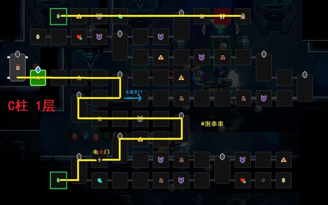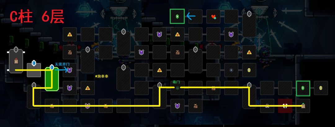 本层吸取1个最低品质,所以要放1个蓝色/绿色品质作为本层祭品。如果你属性门全都打不开,可以走右边蓝色箭头标注的无需开门路线。