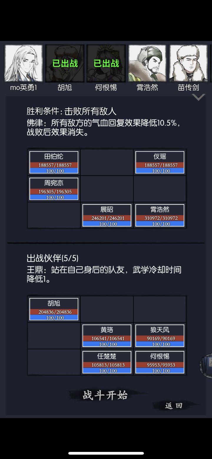 用图二阵容上限高,楚楚先开技能,日给何,然后献祭buff吃满,第二回合小何秒三个,剩下霄浩然和展昭。慢慢拿下