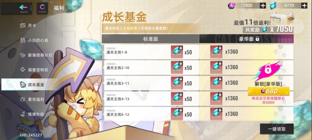 成长基金,第一天可以不用买(只有每天5000虹晶的那种),等你通完了再买也不迟,目前有三个阶段,一样的680虹晶。