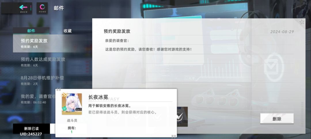 邮件里面可以获得安雅-长夜冰冕,新手配队之一,3星(没记错的话)使用技能可以获得全体盾。