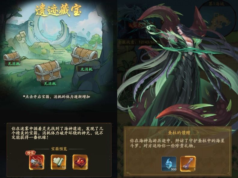 海岛奇遇:除了紧张的战斗外,岛屿之中也有海神宝库、圣柱馈赠等不少奇遇事件等待掌柜发现;若是遇到明灯事件,还可为掌柜驱散雾霭,探明一定范围的地块助力探索。