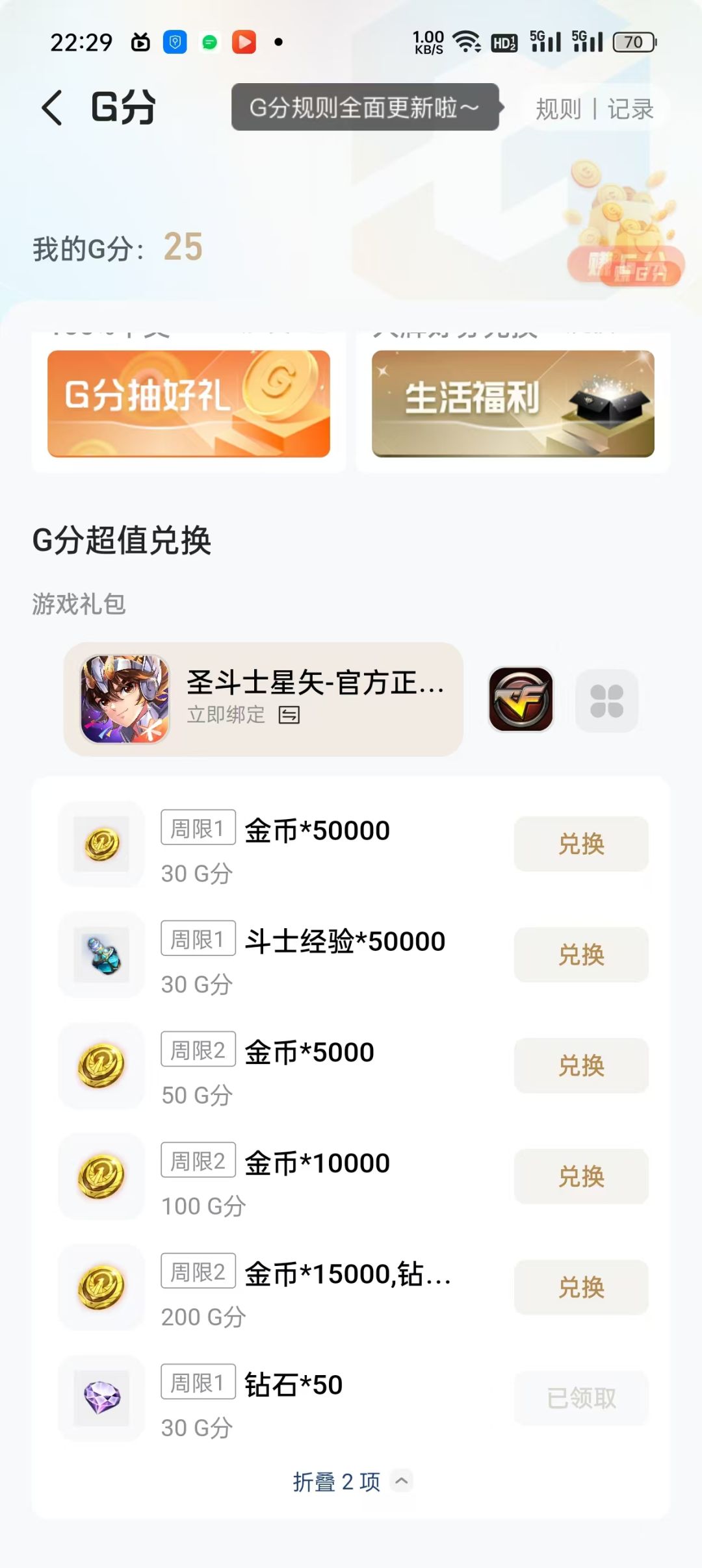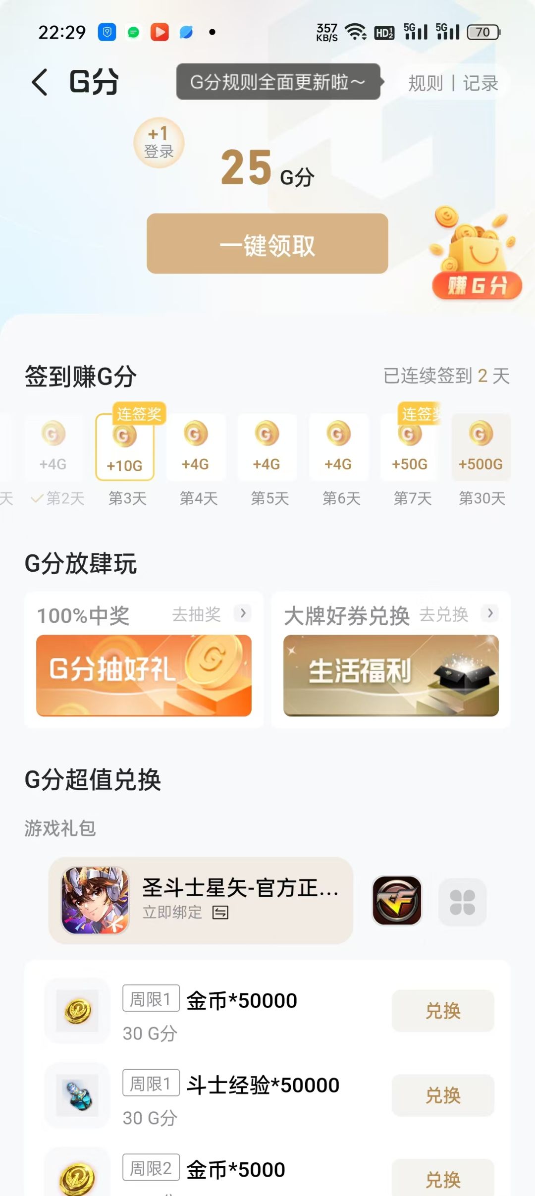G分兑换最下方可以用积分兑换两个钻石礼包,一个是30G分50钻石的礼包,每周一次。另一个是200G分15000金币和50钻石的礼包,每周两次。正常情况下每周至少可以兑换一次30G分50钻石的礼包。