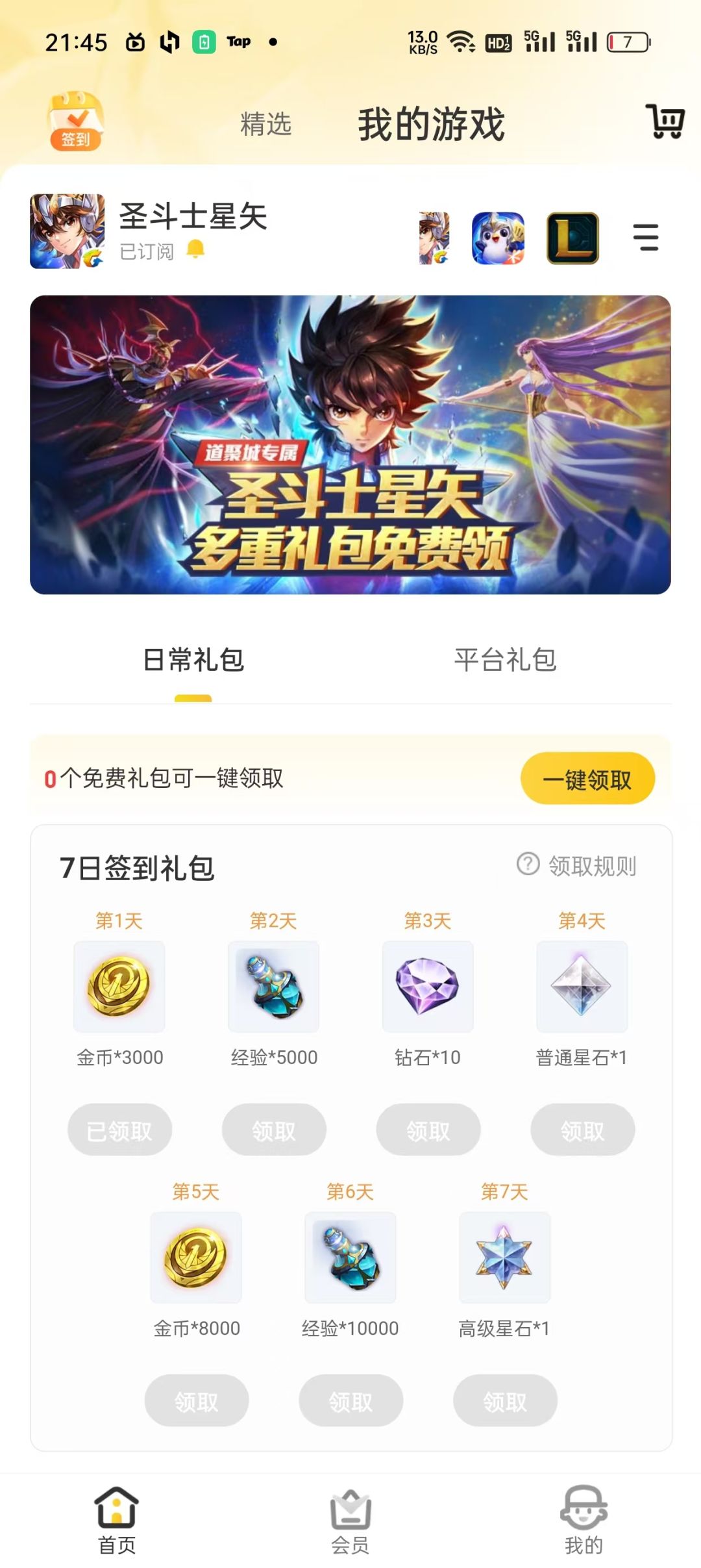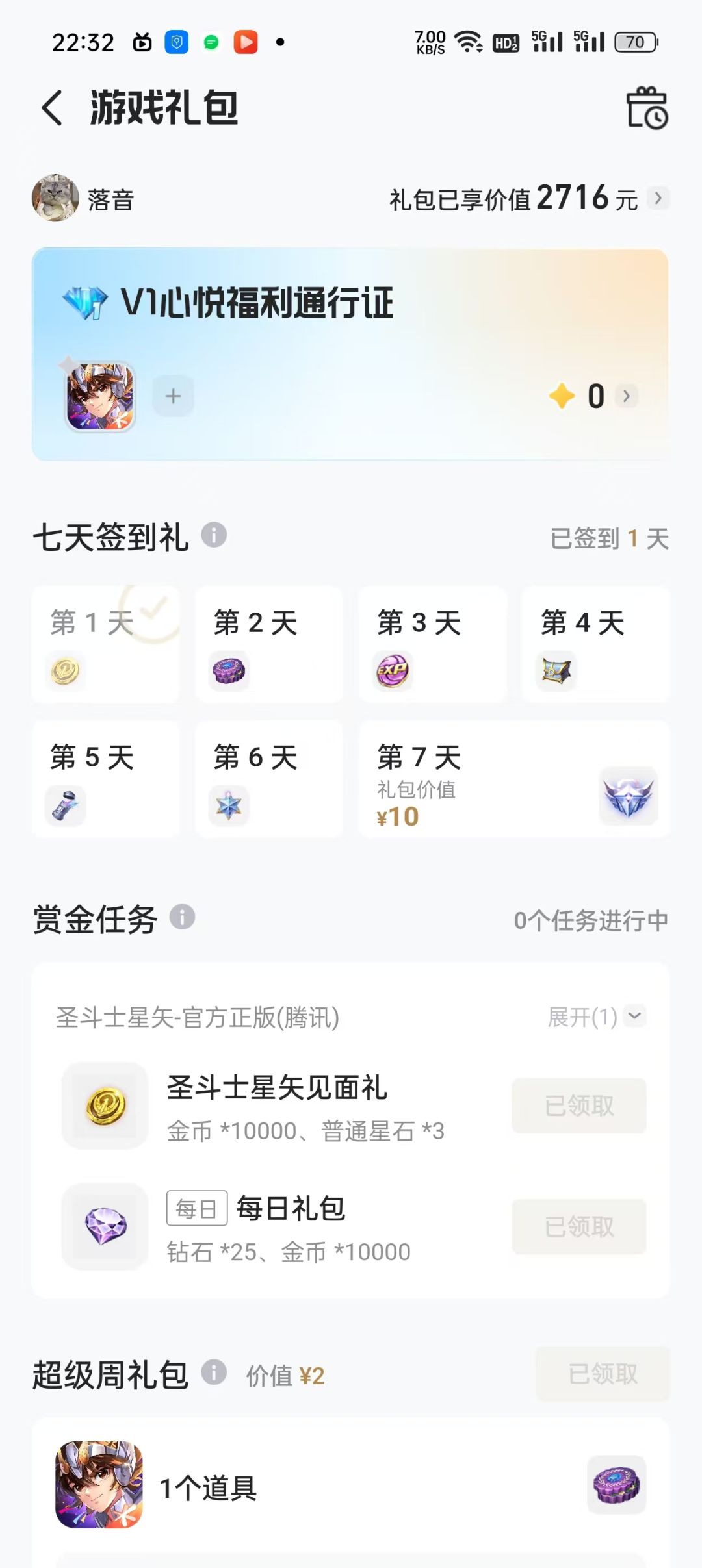 这个页面也有签到奖励,但与心悦俱乐部不同的是,这里的签到不是累计的,比如你只想要第七天的奖励,那只需要在星期日签到即可。下面还有几个的一次性礼包,比如等级礼包和新手礼包。