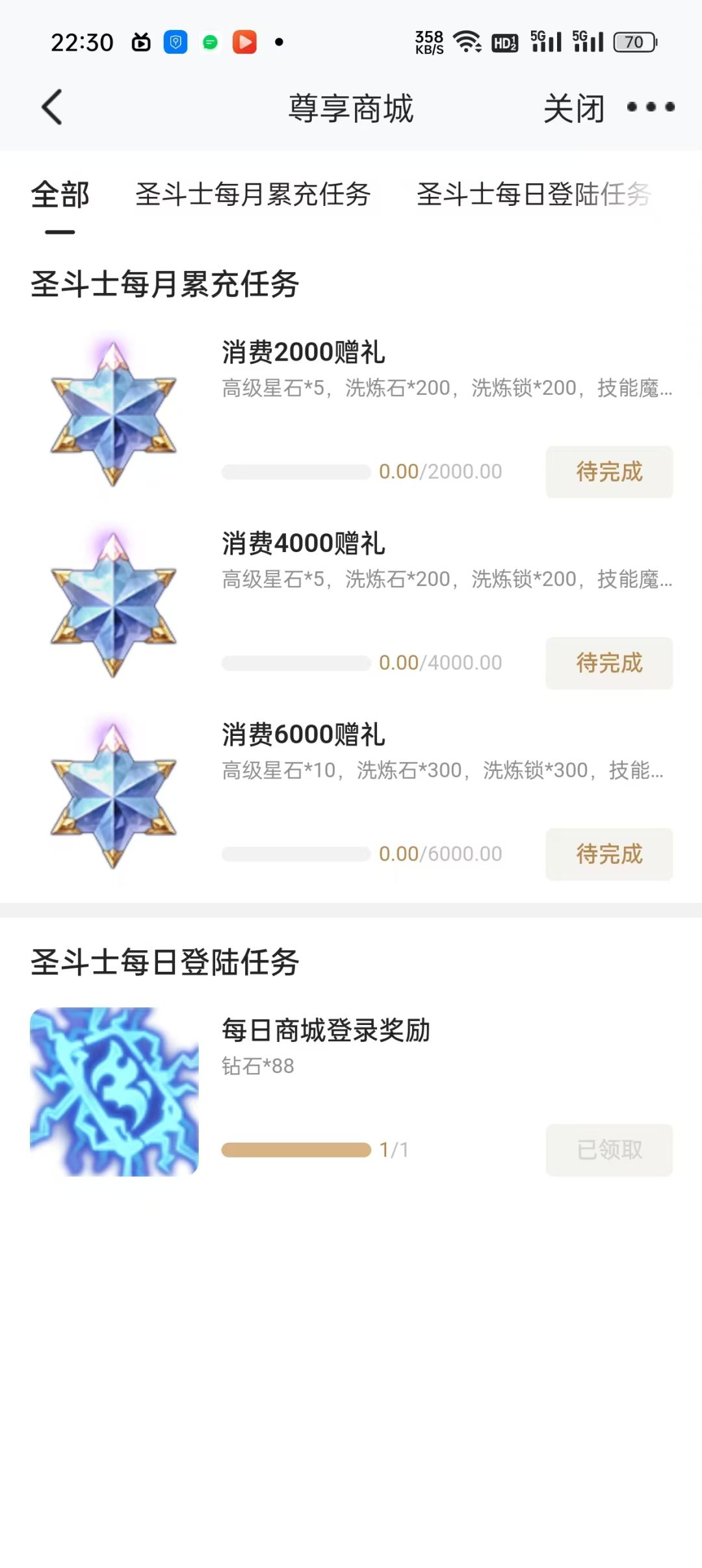 在我的任务的最下方有一个每天签到的奖励,每天都是88钻石,也就是说如果你全勤签到。一个月(按30天算)能拿2600多钻石。
