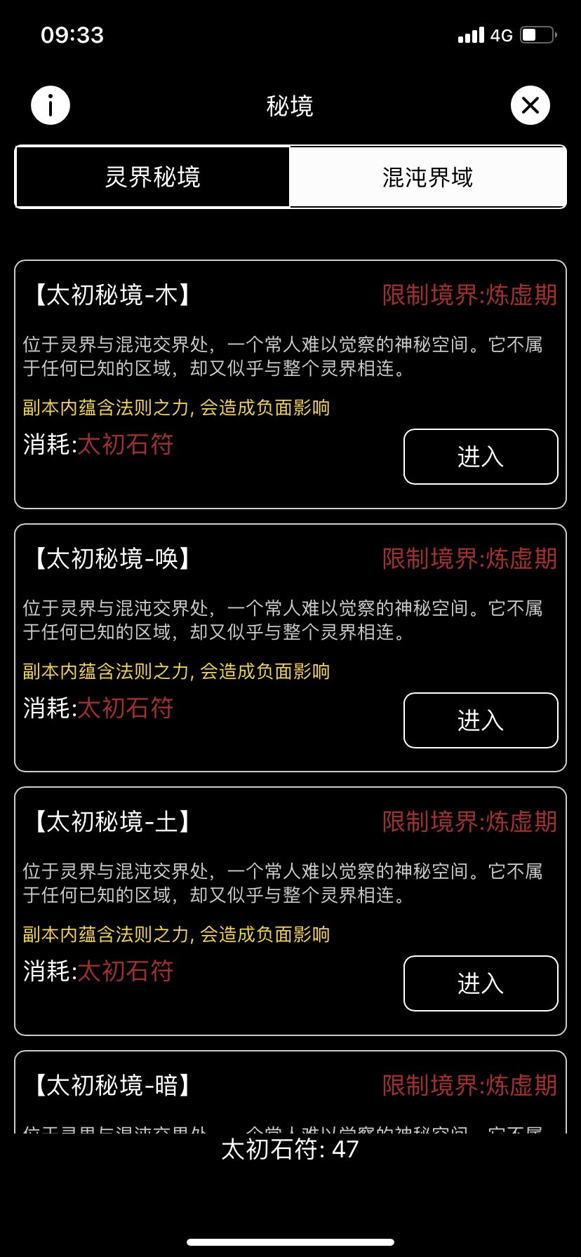 太初石符可用于探索混沌界域之内的17处秘境,每处秘境皆有属于此秘境相对应的专属套装以及大道升级材料 每次探索需消耗1石符