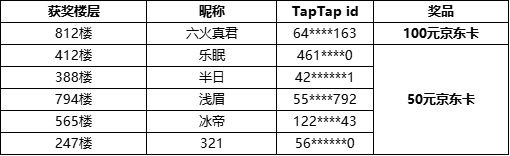- 楼层数≥188时,在参与评论的玩家里总计抽送【价值50元京东卡】*3+【价值100元京东卡】*1