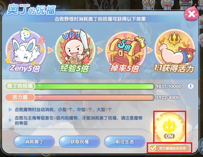 - 使用效果:开启奥丁可以获得5倍刷怪奖励,即5倍Zeny、5倍Base经验、5倍Job经验、5倍卡片掉率;另外还可以根据消耗的奥丁点数1:1转化成【活力值】,活力值用于生活玩法,所以在这里就不提啦