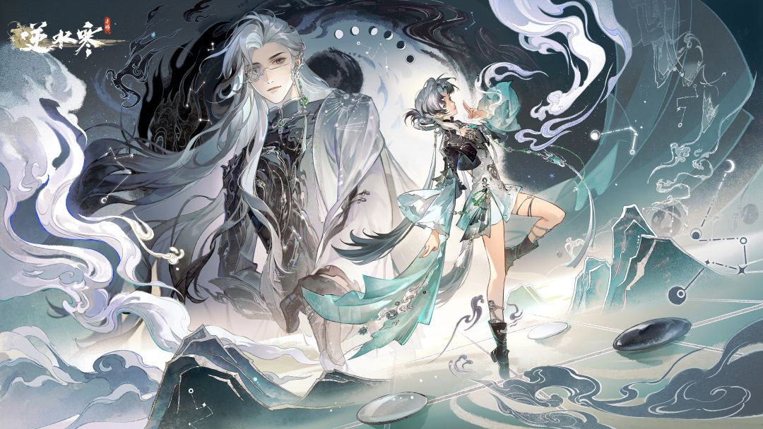 新时装【川峦游墨】灵感来源于眠卧沉渊的黑龙,以墨色为主题色彩,渲染出典雅之意;更将星宿、烟云、水浪等中式传统元素结合其中,共同织就不凡衣袍。