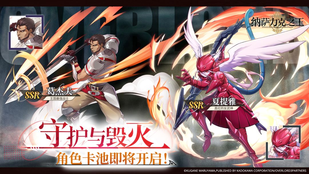 > 活动期间,SSR角色【王国最强战士 葛杰夫】&【真红的女武神 夏提雅】,召唤概率大幅提升,至尊大人可前往【守护与毁灭】角色卡池进行召唤。