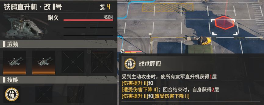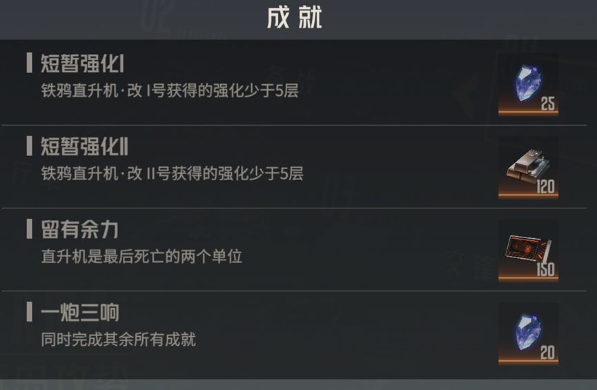 短暂强化1:要求铁鸦直升机改1号获得的强化少于5层,直升机的强化层数的获得非常好理解,首先是其中一架直升机被攻击,会给另一架直升机加1层强化,然后每回合结束会获得2层强化,然后如果某次攻击将直升机消灭,那么该次攻击不会使得另一架直升机获得强化。