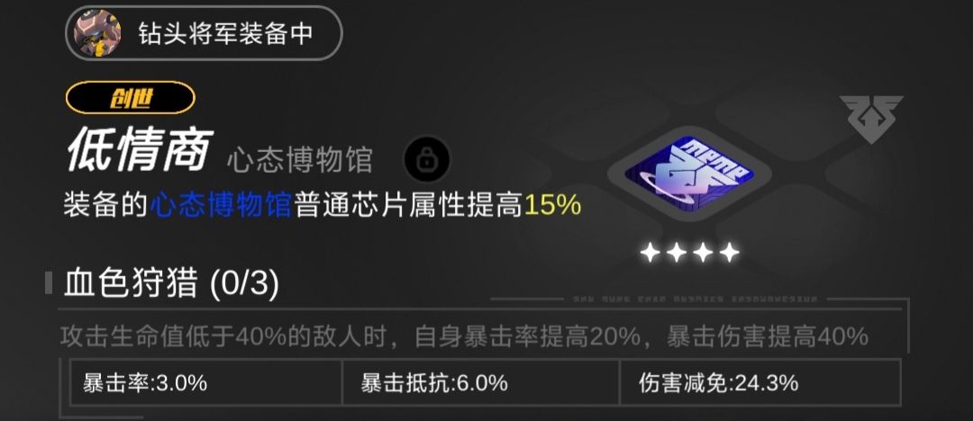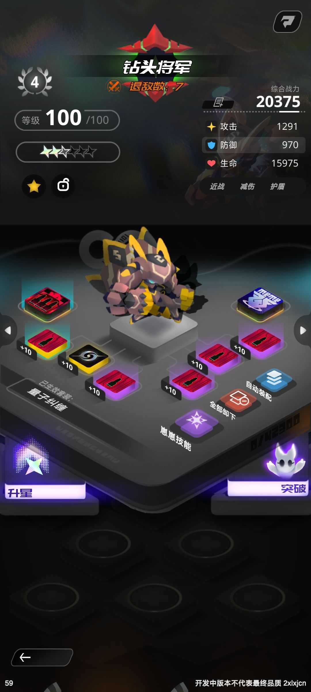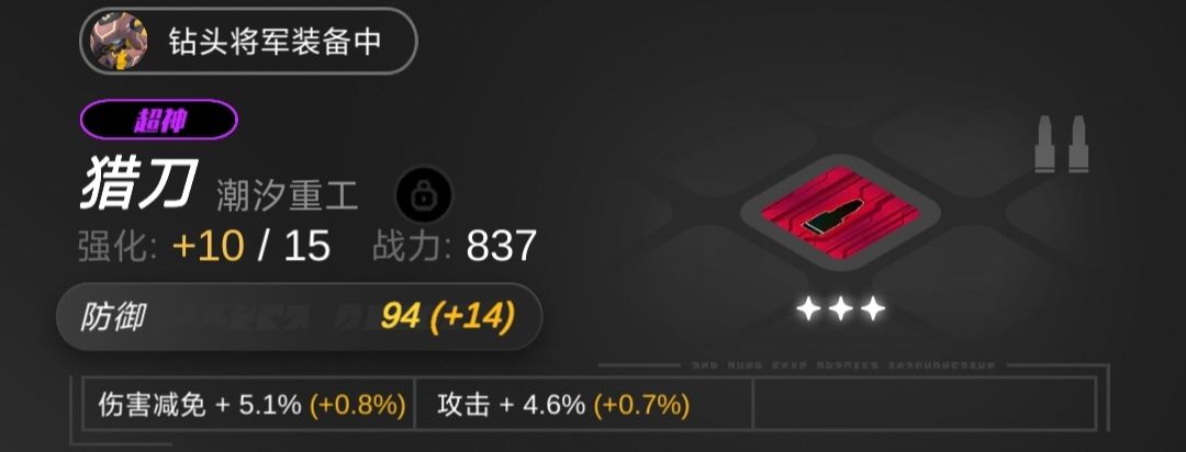 肆、钻头将军——坦,主堆防御,芯片副词条建议减伤(这是看论坛了解到的)生命的话有皮皮,不需要太多,我这只没星级是因为之前抽到的卡全分解换芯片,结果没刷到红,黄星也用完了导致芯片等级低,只能凑合着用