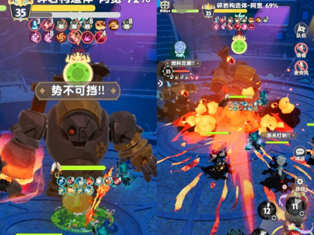 「Boss:碎岩构造体 - 阿宽」蓄力后掀起地面引动岩浆对全体造成少量伤害,如果技能释放时玩家身上拥有 {Buff:燃油粘滞} 则会额外造成少量伤害。