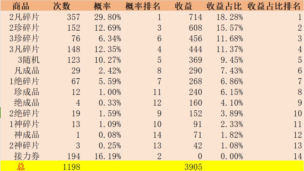 例如,1198份数据中,1绝碎片出现了67次,收益等价于67×4=269片凡碎片~