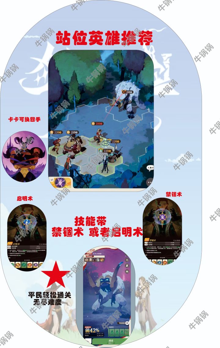 然后呢站位就是跟图中的站位一样的然后我们的技能带禁锢数或者起启明因为禁锢术的话他有加百分之六点多的伤害然后呢启明术可以加攻速。这样我们就可以快速的叠加伤害好了 大家快去挑战吧