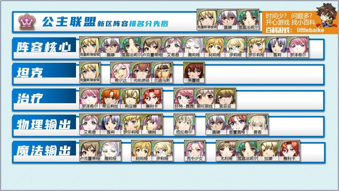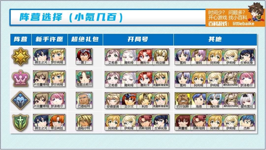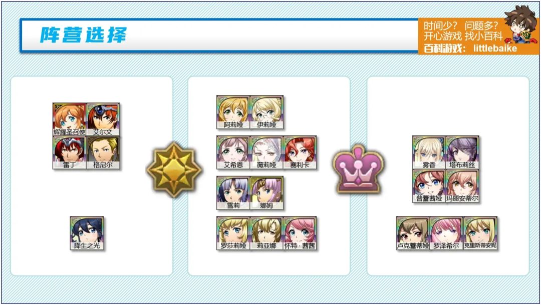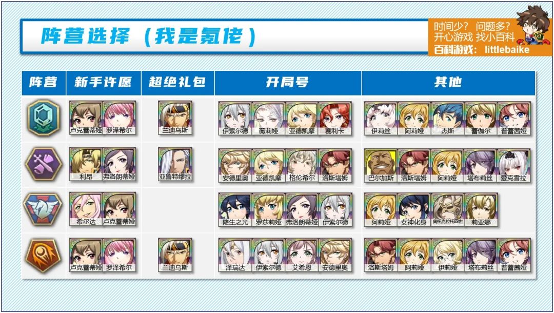 接下来说一下阵营选择。因为双胞胎姐妹花的原因,本次新区必须推荐光辉和公主。两个阵营都很不错,不仅适合新区,后期也很好用。