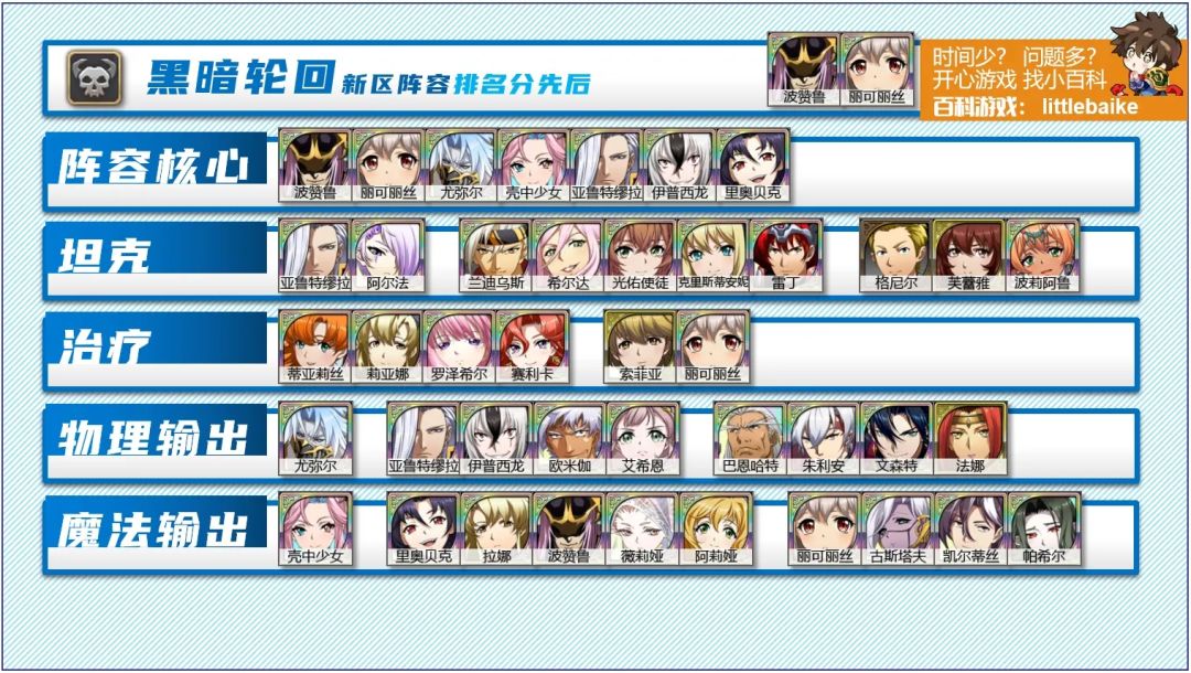 黑暗阵营好久没有起色了,没几个能打的。波赞鲁和丽可丽丝都可以喊超绝。坦克可以用元帅或阿尔法,但是从节省资源的角度考虑,外挂坦克更好。治疗要看情况,波波喊超绝就4选1,丽可丽丝喊超绝就自己奶。物理输出只有尤弥尔不错,不够就选第二档。魔法也只有壳中少女还行,不够也选第二档吧。