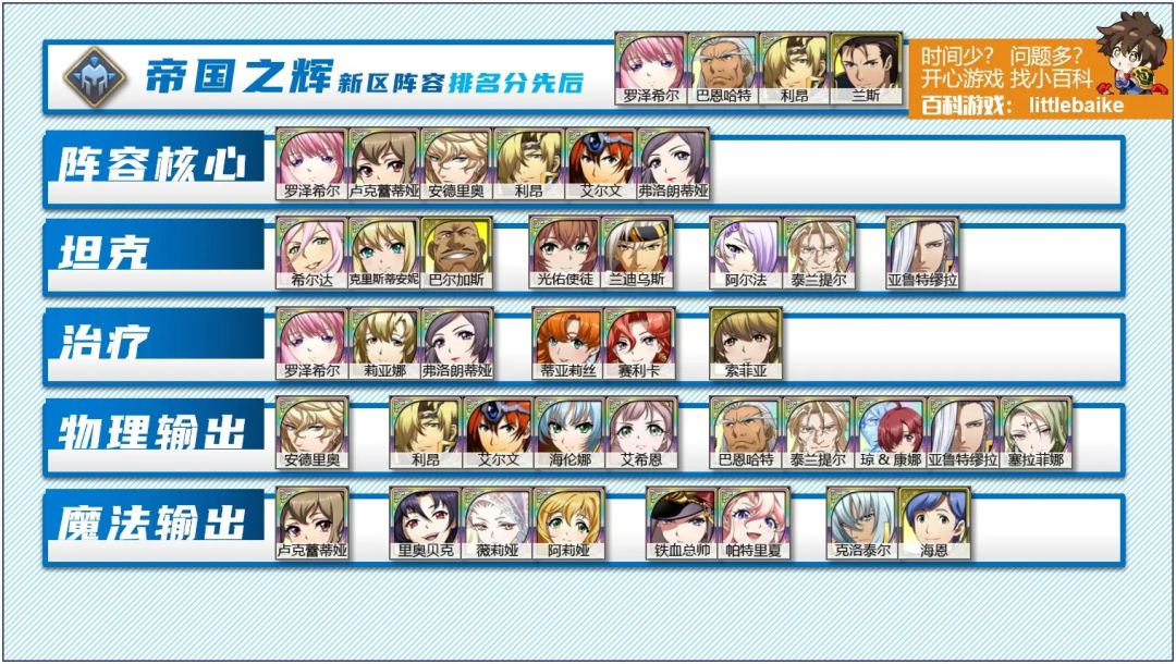 帝国阵营的后期核心是皇帝巴恩哈特,已经开了SP和铸纹,非常强力也非常适合喊超绝。但是前期有点弱,所以新区首选超绝手还是罗泽希尔。没有的话再选皇帝巴恩哈特。利昂和兰斯就不用考虑当超绝手了。坦克可以选希尔达或者花坦克里斯蒂安妮。没有的话直接用光头巴尔加斯也非常不错。治疗肯定是首选超绝手罗泽希尔了。如果没有罗泽希尔,建议体验一下宰相弗洛朗蒂娅。物理输出有利昂和艾尔文。但最好用的还是安德里奥。魔法输出的话,卢克和里奥贝克都是长手法师。但是里奥贝克六星才好用,仅考虑开荒的话,薇莉娅和阿莉娅外挂是个非常好的备选。铁血总帅和帕特里夏也可以选。后面的两个就有点弱了。