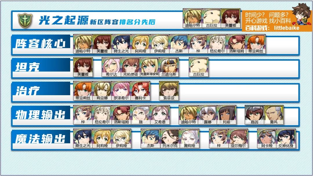 光之起源建议让芙蕾雅喊超绝,顺便还能当坦克。迪哈尔特不太建议练了,有点浪费资源。奶妈还是4选1。物理输出相对一般,第一档的5个都差不多。魔法输出现在厉害了,降生加上新英雄都很好用,第二档也可以考虑。