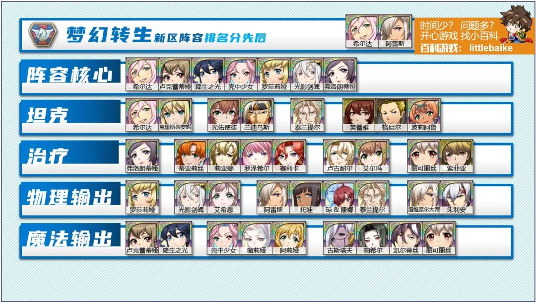 现在新手池补充了大量转生英雄,可惜只能选两个。核心肯定是希尔达,也是必选坦克。治疗非常推荐宰相弗洛朗蒂娅,次选才是4选1。物理输出主要是罗莎莉娅,然后是光影剑魄,不好抽也可以外挂艾希恩。魔法输出肯定是降生和卢克了,卢克要略微好一点。第二档的3个长手法师也不错。