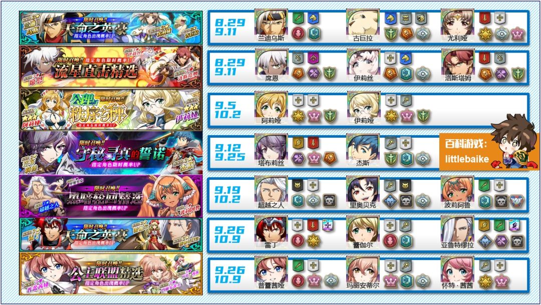 这里是小百科整理的本次新区卡池。前两行是上一期留下来的卡池,大概率新区直接开。洛斯塔姆相对好很多,资源多可以试着抽一下。最大卖点是9月5日10点可抽的伊莉娅和阿莉娅,至少抽一个,肯定不亏。9月12日的双UP池。杰斯的强度不错,还能给龙妈开羁绊。9月19日的黑暗精选池,里奥贝克能用,还能给尤弥尔开羁绊。另外两个新区没用。9月26日的天命池,蕾伽尔可以给兰迪开羁绊,有一点抽的价值。另外两个超绝礼包直接送。最后还有一个公主精选池。普蕾茜娅可以给龙妈和薇莉娅等强力英雄开羁绊,资源多可以抽一下。怀特茜茜当奶妈也能用。如果想了解这些英雄池的详细解读,可以看一下小百科的梦战英雄池预览&详解系列视频,也可以在小程序【梦战百科小助手】中随时查看英雄池和领取礼包码哦。