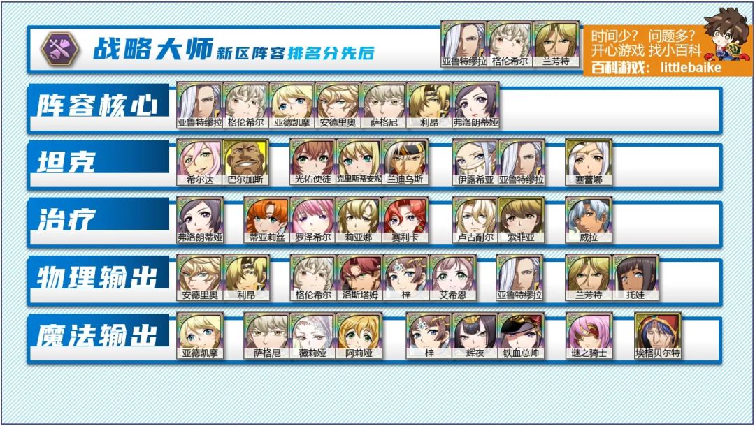 传说阵营核心是龙妈伊索尔德、薇莉娅和亚德凯摩。但想搞到这3个非常难,开局号能选到两个就惊喜了。可以考虑换阿莉娅和杰斯,好抽很多。兰迪是超绝手兼坦克,奶妈可以带罗泽。许愿池没有传说的,可以先存个卢克。战略阵营前期要利昂、元帅亚鲁特缪拉和宰相弗洛朗蒂娅,坦克可以用SR英雄光头巴尔加斯。有物理核心安德里奥和后期超绝手格伦希尔就更好了。法师核心是亚德凯摩,后面的洛斯塔姆也很好,还能开羁绊。转生阵营一堆强力英雄进了新手池,问题是只能选两个来抽。小百科建议先把希尔达和卢克搞定,剩下的降生、银骑、宰相就只能买开局号了。还少人的话可以抽个阿莉娅。流星阵营的新英雄实在是太强了,但是都不好抽,投入肯定非常大。而且本期没有超绝手,只能买泽瑞达开局号。另外流星阵营法师少,奶妈少,坦克也少,能氪的高玩可以试试,新手还是算了。