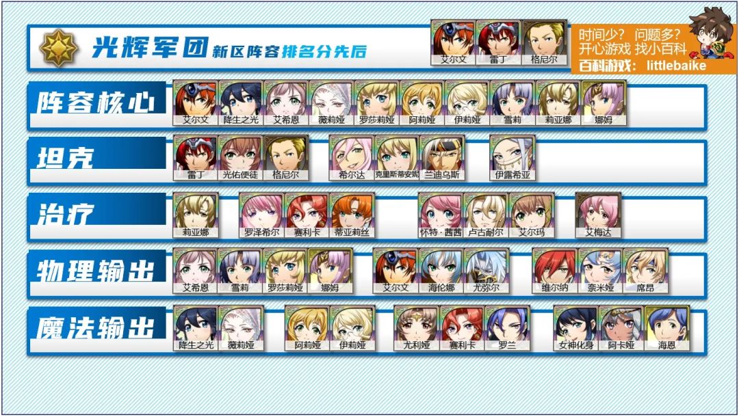 接下来是每一个阵营的阵容推荐,仅含本次新区能获得的英雄。以光辉军团为例,我们首先需要一个超绝手。然后选一个坦克。再选一两个治疗、两个物理输出、两个魔法输出,就差不多了。所有的阵营我都按照推荐顺序给了一个排列。放在一起的就是档次差不太多的,没有明显区别。如果是这个表上没有的英雄,就不推荐来练。想练也可以,仅作为一个过渡。不要投入太多的资源。