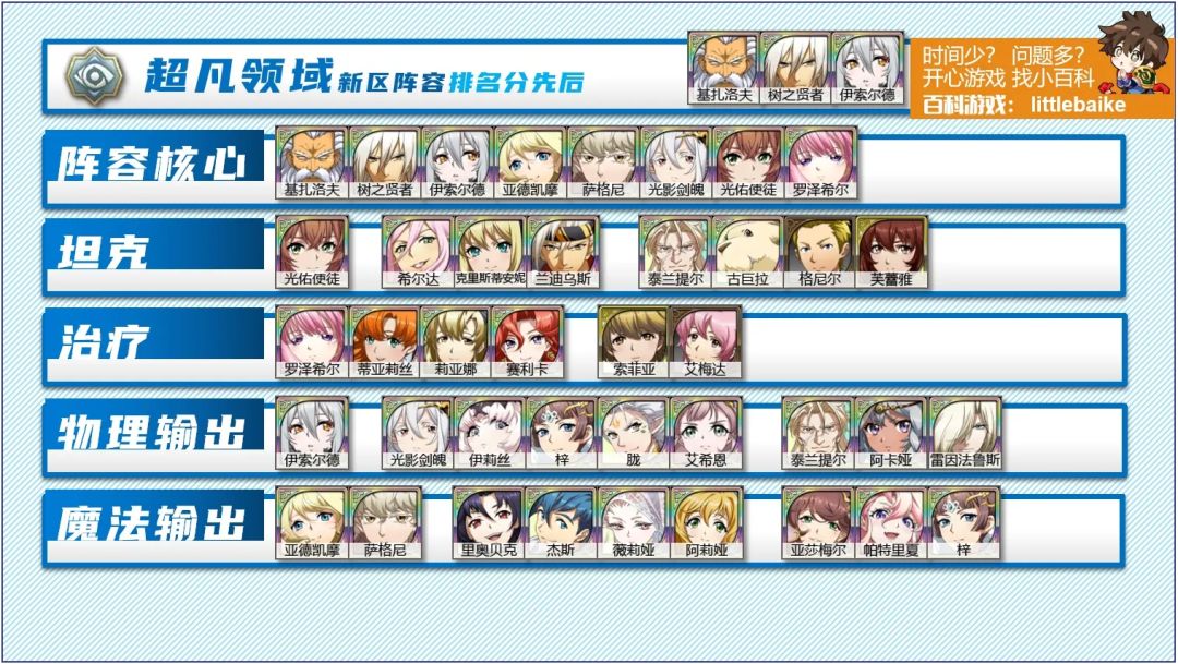 超凡阵营最弱的就是超绝手了。前面两个都不怎么样,好在现在有了龙妈伊索尔德。但是龙妈前期不能喊超绝,有点尴尬。可能还是要练个老头过渡一下。坦克的首选肯定是镜坦光佑使徒,就是不太好抽。不行就练后面3个外挂坦克,比如送的兰迪。奶妈依旧是4选1。物理输出和魔法输出,优秀的实在是太多了。前两档随便选几个就可以了,后面的就不用考虑。
