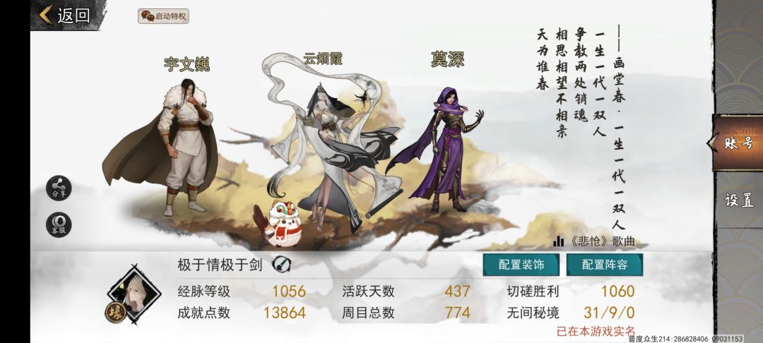 虽玩的时间不算太长,中间也断断续续退过游,但游戏时长也有400天了,虽比不上那些一千多天的牛人,但也承载了一年多的记忆,尽管早己知晓我侠命不久矣,但没想如此突然,心中有些许落寞。所以写下此贴,作为记念。主要是一些截图,