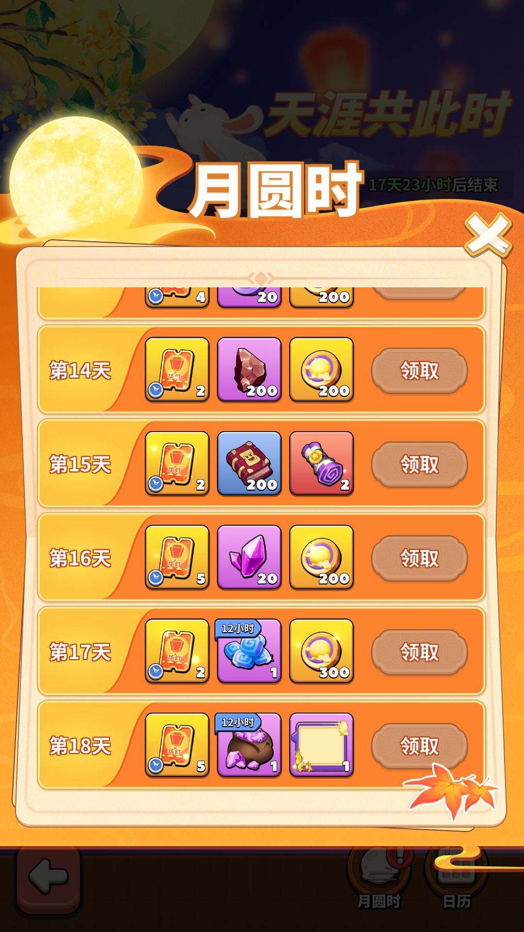 活动期间,每天登录即可领取月圆时奖励,领灯会入场券、集追月点数、获取聊天气泡·金桂流芳!