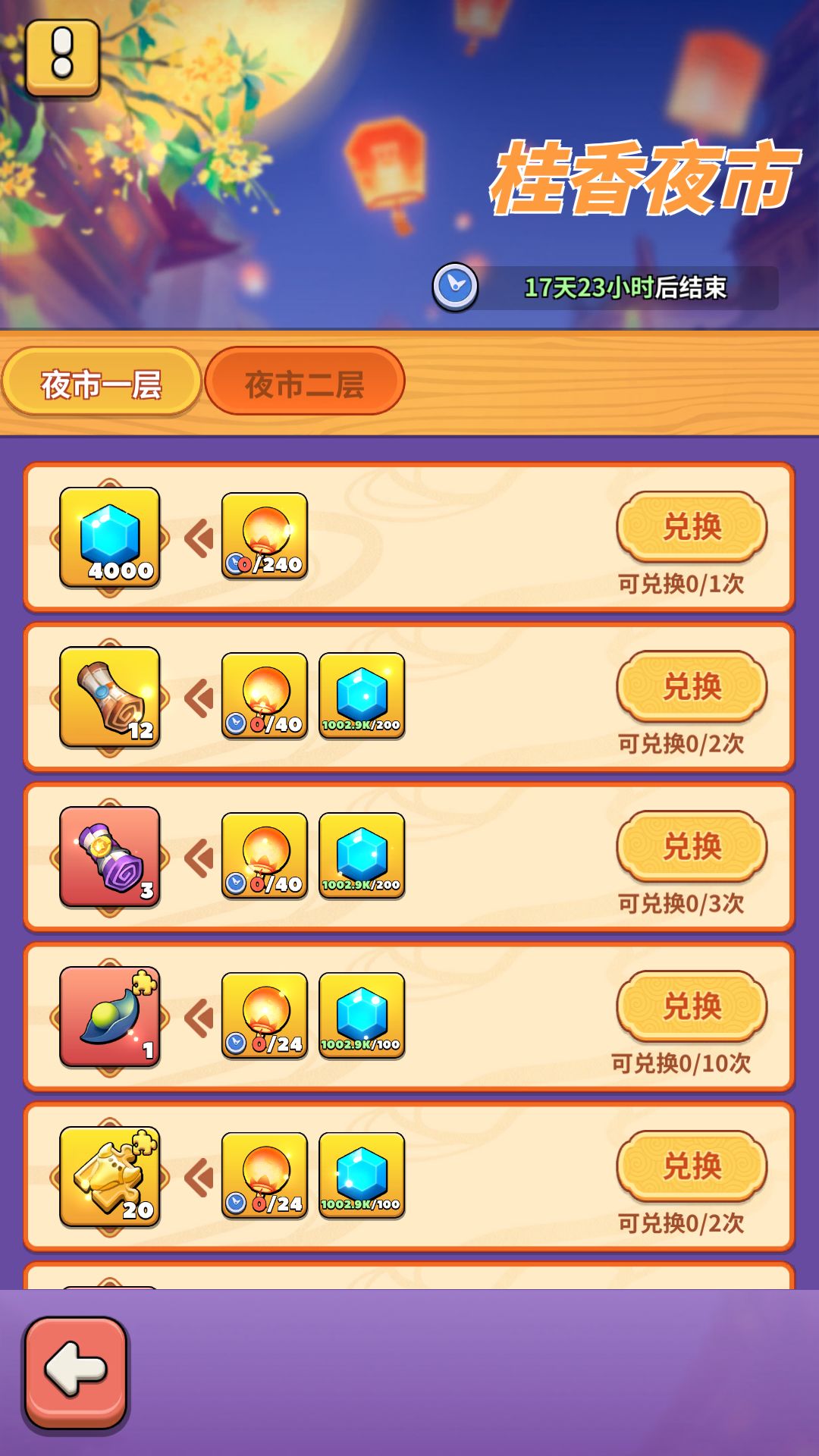 活动期间,在华灯映月共婵娟以及其他途径获得的映月花灯,可在桂香夜市兑换奖励。根据每一项奖励的要求,凑齐对应的道具,即可兑换奖励。每种奖励的兑换次数限制不同,请合理规划道具消耗哦~
