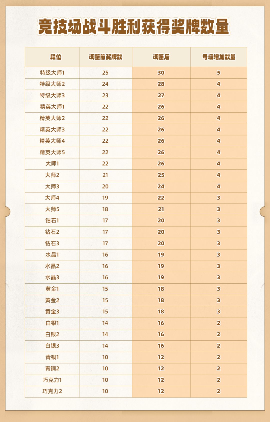 竞技场所有段位战斗胜利所获得的奖牌上调20%,详细调整数量请大家参照下表